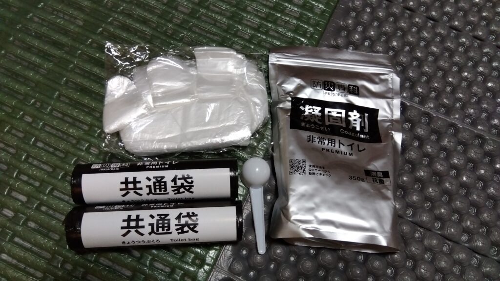 内容は、汚物入れなど共通袋が4ロール、手袋、凝固剤2袋、スプーン2個です。